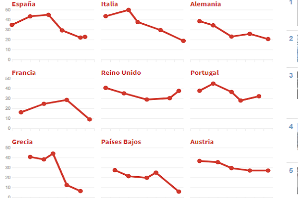 En el siguiente mapa se puede observar en qué países están actualmente en el poder la derecha y el centro-derecha (azul), la socialdemocracia, en solitario o coalición (rojo), los populistas de izquierdas y los verdes. En Italia, todavía en rojo por el gobierno socialista en funciones, el poder está aún por decidir después de unas elecciones donde el partido más votado ha sido la izquierda populista del Movimiento 5 Estrellas.