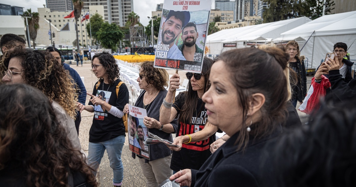 Entre veladoras blancas y enormes carteles con los rostros de los rehenes, los manifestantes se congregaron en la plaza del Museo de Tel Aviv, ahora bautizada "Plaza de los Rehenes", al grito de "!tráiganlos a casa ahora, ahora!".