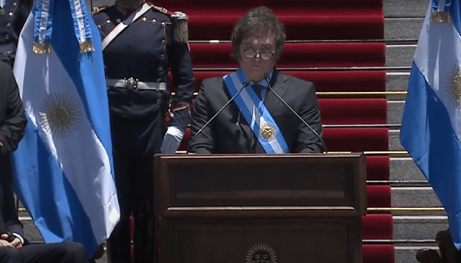 "Hoy comienza una nueva era en Argentina", proclamó en el arranque de su discurso desde una tribuna frente al Congreso de la Nación, en la que estuvo flanqueado por los principales jefes de Estado y de Gobierno presentes en su toma de posesión, el rey Felipe VI; los presidentes de Ucrania, Volodímir Zelenski; Uruguay, Luis Lacalle Pou; Paraguay, Santiago Peña, y Chile, Gabriel Boric, quienes ya habían asistido a la jura oficial.