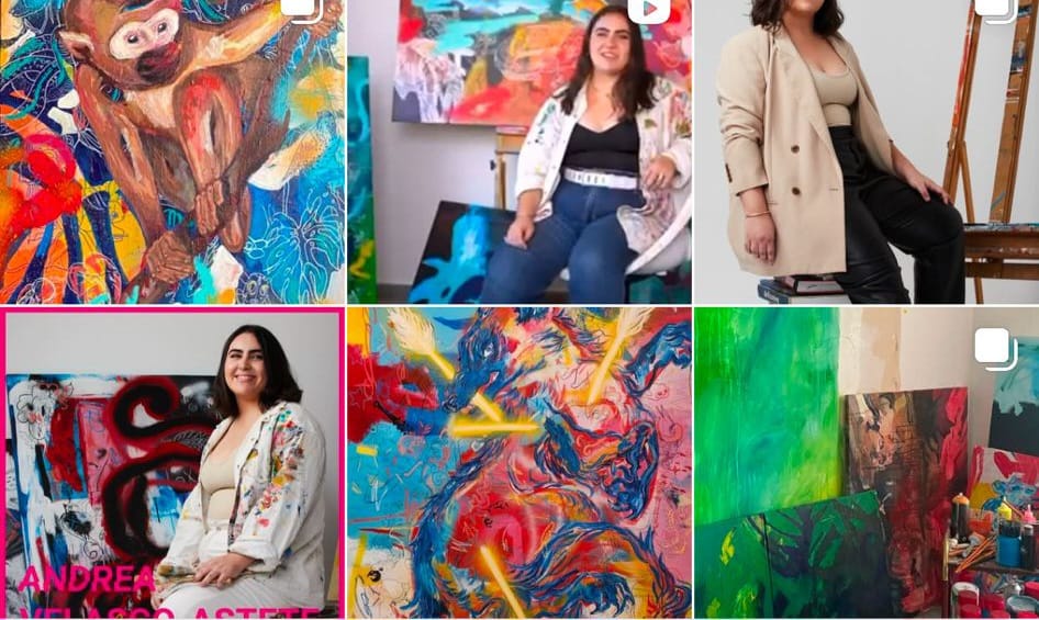 La técnica que utiliza la pintora Andrea Velasco Astete es mixta sobre lienzo (acrílico, pintura en spray, oleo, ceras permanentes y rotulaciones acrílicas).